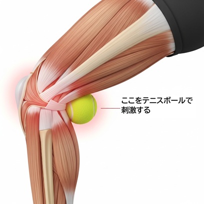 ここに、テニスボールを当てて足で挟んで指圧に変えた。